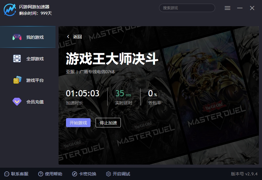 很多玩家反馈下载时速度特别慢,或者进入游戏后出现卡顿、掉线问题。这是因为游戏服务器在海外,国内直连网络质量不稳定。这时候推荐使用闪游加速器电脑版,专门优化这类跨国联机游戏的数据传输通道。只需要在加速器里搜索游戏王大师决斗一键加速,就能有效解决: