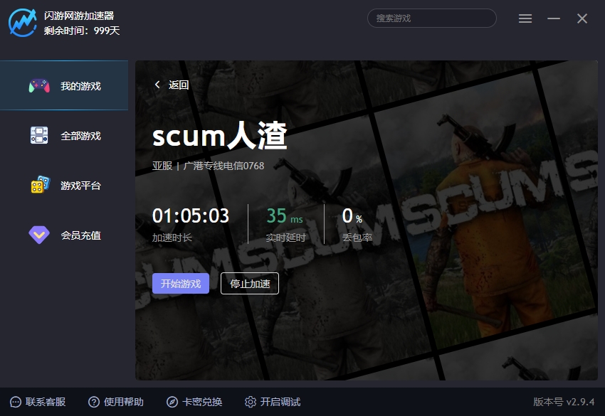 新用户可兑换免费7天会员:在闪游加速器客户端点击"兑换",输入闪游666即可激活。加速后进入SCUM训练场测试,观察右上角网络指标(按Tab查看),延迟稳定在60ms以下表示加速成功。
